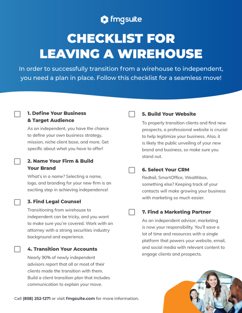 Start by determining your business strategy and niche clients. Then, consider the name of your new firm and build your brand. You may also choose to join an existing firm, which makes the process a bit easier. From there, you can begin to transition your accounts and retain your financial advisory clients. Now that you have clients and a business structure, it’s time to get a website and a CRM, which will allow you to stay in touch with your clients and better serve them. To complete your transition, selecting a marketing partner to help you take your business to the next level is highly advised.
